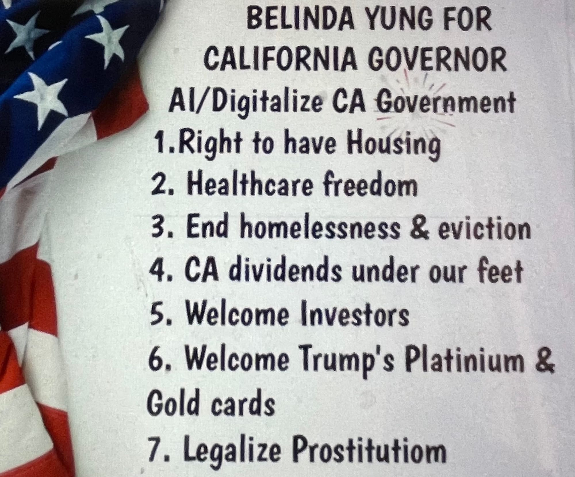 My name is Belinda Yung. I am running for California Governor. I have retired since 2024. I was born, raised, and educated in Hong Kong. I came to CA through the main gate in November 1984. I personally experienced the hardship to raise up two daughters after the divorce in 1999. Looking back the leadership in CA, the problems continue to rise. I believe “Living Better, Brighter Future” is the right for every Californian who is living in CA. I am proud of you all surviving from the mismanagement and dysfunctions of the CA government. The (1) budget crisis, (2) housing crisis, (3) homeless crisis, (4) at least 400,000 Californians on the waiting list for housing assistance, (5) lack of public housing to guarantee Californians’ right to have housing, and (6) the skyrocketing living costs have been lighted up the serious problems of the failed governor and his government, lack of leadership and vision. Californians deserve the CHANGE: Living Better, Brighter Future. Californians deserve a better leader and I am that leader. Please vote for me as your next governor in 2026. I’ll prioritize Californians’ benefits in the midst of the nation’s interests. As your next governor, I’ll do: (1) AI/Digitalize the CA Government, (2) Right to Have Housing, (3) Healthcare Freedom, (4) the CA Dividends Under Our Feet, (5) Welcome Investors, (6) Welcome Trump’s Platinum and Gold Cards, (7) End Homelessness & Eviction, and (8) Legalize Prostitution.